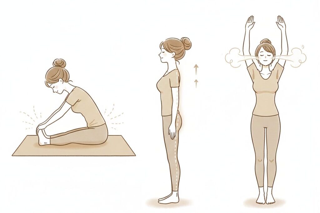 股関節まわりや肋骨、太ももの前を軽くほぐすところから。